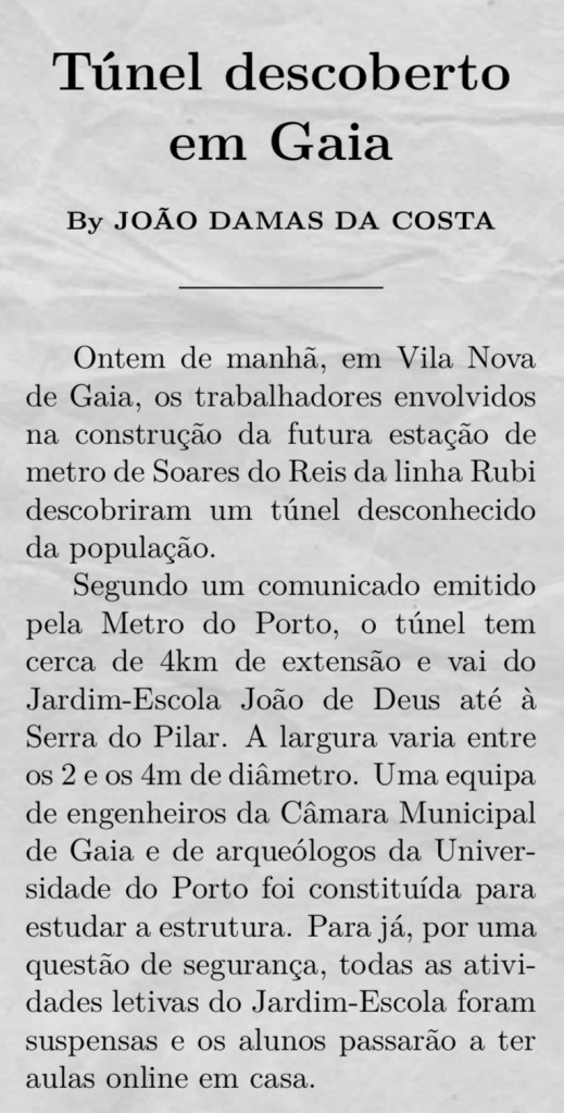 Na escola, estamos a aprender a estrutura de uma notícia. Falamós sobre o título, o lead ( O quê? Quem? Quando? Onde?) e o corpo da notícia (Como? Porquê?) e a professora pediu-nos para escrecver uma.