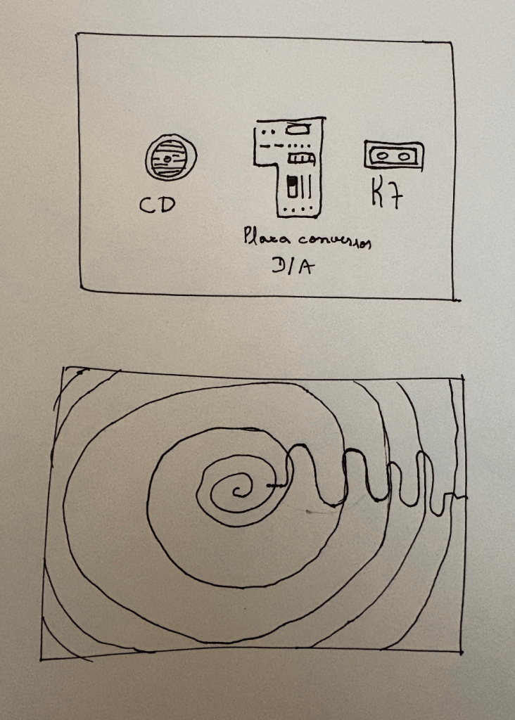O meu primeiro desenho do diorama definia desde logo as suas três componentes: CD, conversor e cassete (K7).